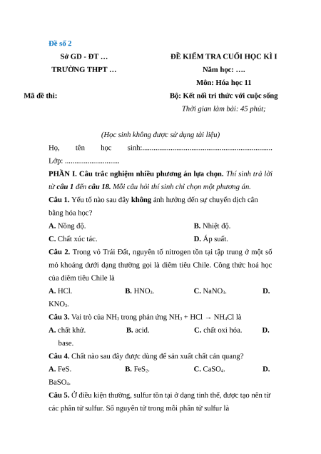 Câu 1. Yếu tố nào sau đây không ảnh hưởng đến sự chuyển dịch cân bằng hóa học? A. Nồng độ. B. Nhiệt độ. C. Chất xúc tác. D. Áp suất.
