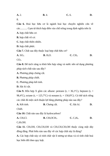 Câu 6. Hoá học hữu cơ là ngành hoá học chuyên nghiên cứu về