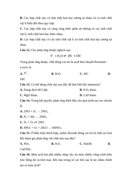 Câu 16. Mưa acid tàn phá nhiều rừng cây, ăn mòn nhiều công trình kiến