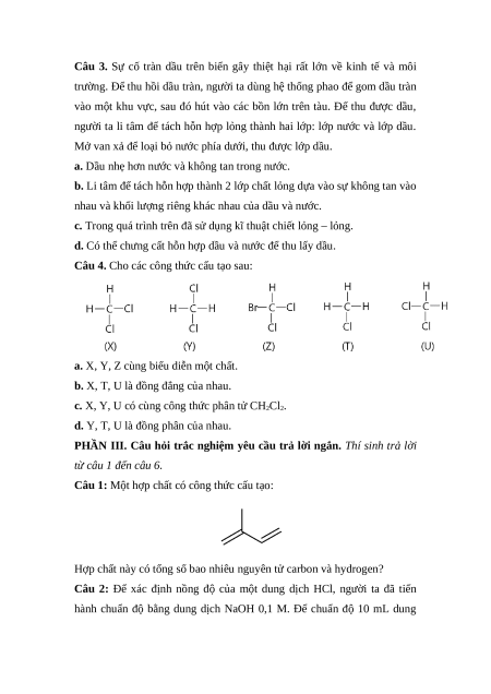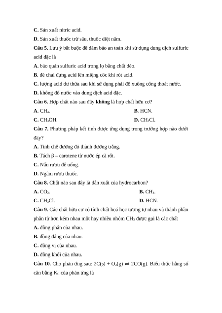 Câu 8. Chất nào sau đây là dẫn xuất của hydrocarbon? A. CO2. B. CH4. C. CH3Cl. D. HCN.