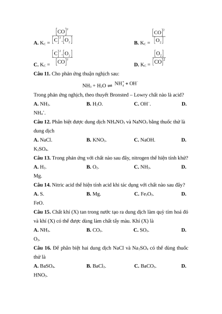 Câu 11. Cho phản ứng thuận nghịch sau: NH3 + H2O ⇌