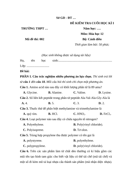 ĐỀ KIỂM TRA CUỐI HỌC KÌ I TRƯỜNG THPT … Năm học: …. Môn: Hóa học 12 Mã đề thi: 002 Bộ: Cánh diều