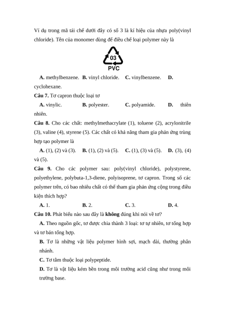 Câu 9. Cho các polymer sau: poly(vinyl chloride), polystyrene,
