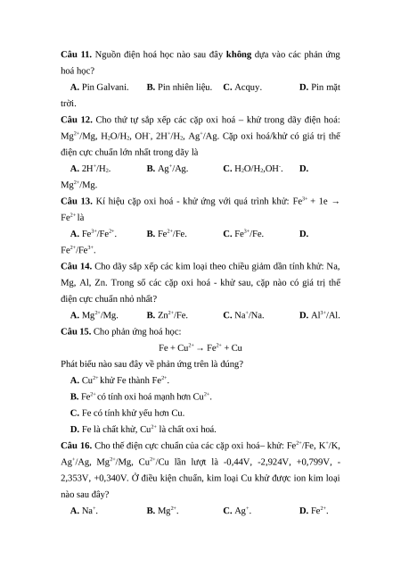 Câu 11. Nguồn điện hoá học nào sau đây không dựa vào các phản ứng hoá học? A. Pin Galvani. B. Pin nhiên liệu. C. Acquy. D. Pin mặt trời.