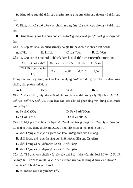 Câu 13. Cặp oxi hoá- khử nào sau đây có giá trị thế điện cực chuẩn lớn hơn 0? A. K+/K. B. Li+/Li. C. Ba2+/Ba. D. Cu2+/Cu.