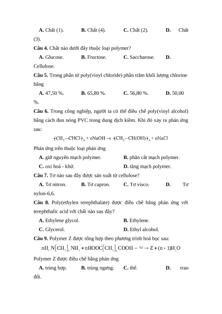Câu 4. Chất nào dưới đây thuộc loại polymer? A. Glucose. B. Fructose. C. Saccharose. D. Cellulose.