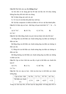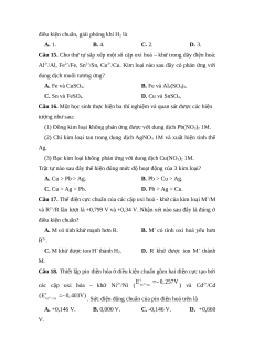 Câu 13. Cặp oxi hoá- khử nào sau đây có giá trị thế điện cực chuẩn lớn hơn 0? A. K+/K. B. Li+/Li. C. Ba2+/Ba. D. Cu2+/Cu.