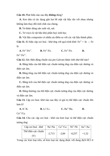 Câu 14. Cho các cặp oxi hoá - khử của kim loại và thế điện cực chuẩn tương ứng: Cặp oxi hoá - khử Na+/Na Ca2+/Ca Ni2+/Ni Au3+/Au Thế điện cực chuẩn -2,713 -2,84 -0,257 +1,52 (V)