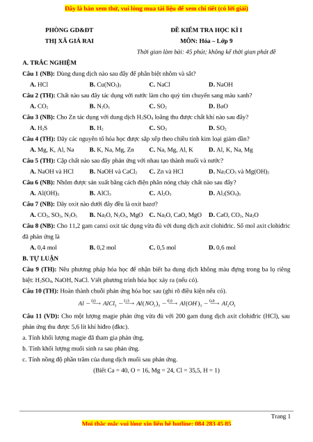 ĐỀ KIỂM TRA HỌC KÌ I THỊ XÃ GIÁ RAI MÔN: Hóa – Lớp 9