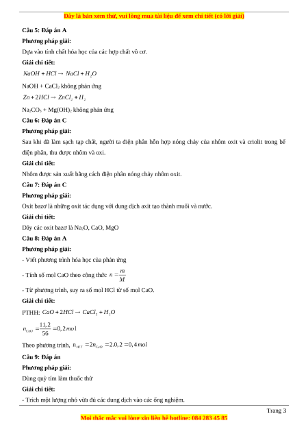 Câu 5 (TH): Cặp chất nào sau đây phản ứng với nhau tạo thành muối và nước? A. NaOH và HCl B. NaOH và CaCl2 C. Zn và HCl D. Na2CO3 và Mg(OH)2