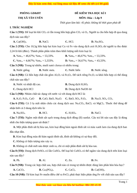 ĐỀ KIỂM TRA HỌC KÌ I THỊ XÃ TÂN UYÊN MÔN: Hóa – Lớp 9