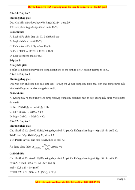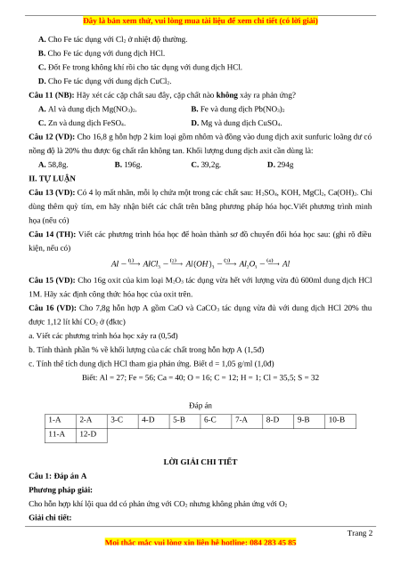 Biết: Al = 27; Fe = 56; Ca = 40; O = 16; C = 12; H = 1; Cl = 35,5; S = 32 Đáp án 1-A 2-A 3-C 4-D 5-B 6-C 7-A 8-D 9-B 10-B 11-A 12-D LỜI GIẢI CHI TIẾT