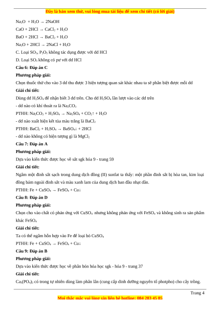 Câu 5 (NB): Nhóm chất tác dụng với nước và với dung dịch HCl là: A. K2O, P2O5, CaO B. CaO, BaO, Na2O. C. BaO, SO3, P2O5. D. Na2O, SO3, CO2.