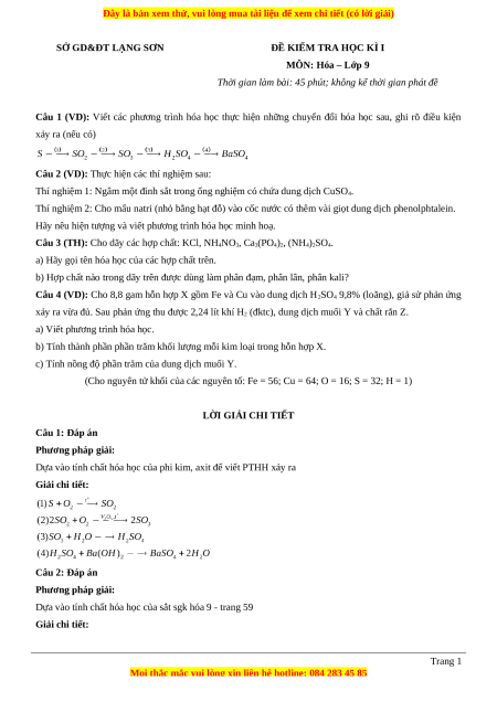 Đề thi cuối kì 1 Hóa học 9 sở GD&ĐT Lạng Sơn