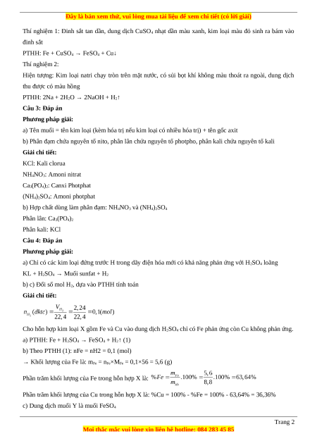 PTHH: Fe + CuSO4 → FeSO4 + Cu↓ Thí nghiệm 2: