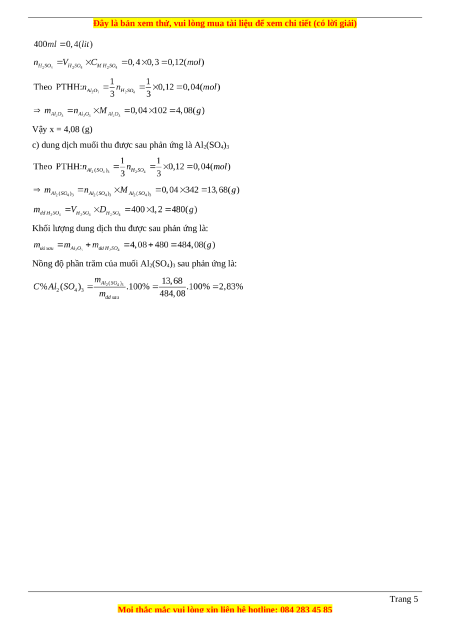 Câu 9 (VD): Hòa tan x gam Al2O3 bằng 400 ml dung dịch H2SO4 0,3M vừa đủ (D = 1,2 g/ml).