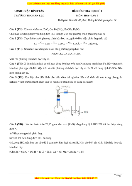 Đề thi cuối kì 1 Hóa học 9 trường THCS An Lạc