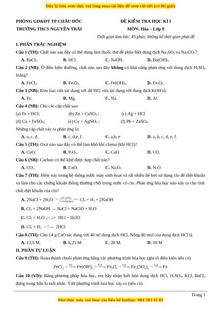 Đề thi cuối kì 1 Hóa học 9 trường THCS Nguyễn Trãi