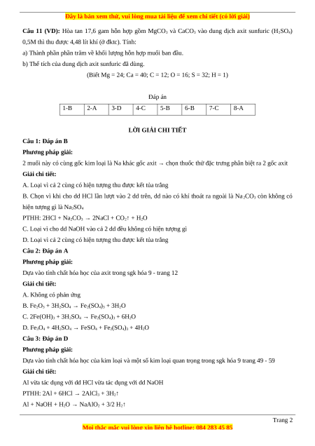 (Biết Mg = 24; Ca = 40; C = 12; O = 16; S = 32; H = 1) Đáp án 1-B 2-A 3-D 4-C 5-B 6-B 7-C 8-A LỜI GIẢI CHI TIẾT
