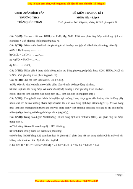 Đề thi cuối kì 1 Hóa học 9 trường THCS Trần Quốc Toản