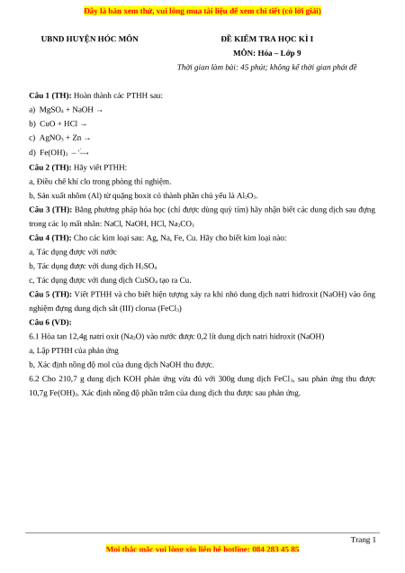 Đề thi cuối kì 1 Hóa học 9 UBND Huyện Hóc Môn
