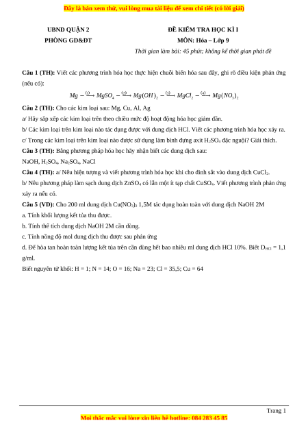 Đề thi cuối kì 1 Hóa học 9 UBND Quận 2 TP HCM