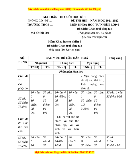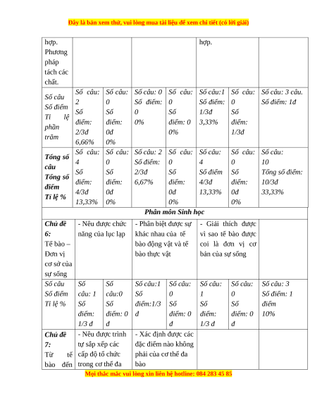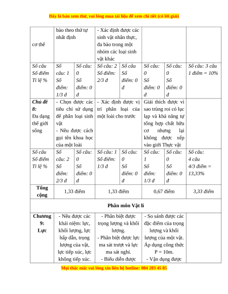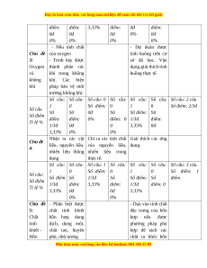 Số điểm điểm: điểm: 0% điểm: 1/3 điểm: Tỉ lệ % 0đ 0đ 0đ 3,33% 0đ 0% 0% 0% 0% - Chỉ ra vật thể tự Chủ đề nhiên và vật thể 2: Các nhân tạo, vật vô thể của sinh và vật hữu chất. sinh. Số câu Số câu: Số Số câu: 1 Số Số câu: Số Số câu: Số điểm 0 câu:0 Số điểm: câu:0 0 câu:0 1 câu Tỉ lệ % Số Số 1/3 đ Số Số điểm: Số Số điểm 1/3