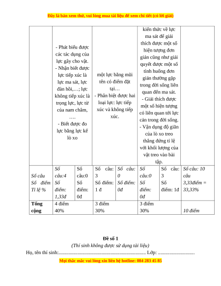 Số câu: Số câu: 1 Số câu: Số câu: Số câu: Số câu: Số điểm câu: 2 0 Số điểm: 0 1 0 4 câu Tỉ lệ % Số Số 1/3 đ Số Số Số 4/3 điểm = điểm: điểm: 0 điểm: 0 điểm: điểm: 0 13,33% 2/3 đ đ đ 1/3 đ đ Tổng 1,33 điểm 1,33 điểm 0,67 điểm 3,33 điểm cộng Phân môn Vật lí Chương - Nêu được các - Phân biệt được - So sánh được các 9: khái niệm: lực,