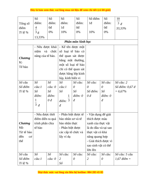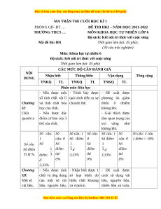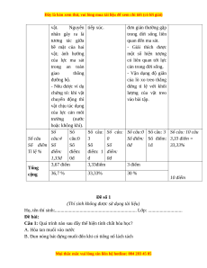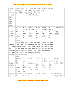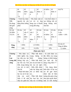 niệm và chức số loại tế bào có năng của tế bào. thể quan sát được Chương bằng mắt thường, V: một số loại tế bào Tế bào chỉ có thể quan sát được bằng lớp kính lúp, kính hiển vi Số câu Số Số Số Số câu: Số câu: Số câu: Số câu: 2 Số điểm câu:1 câu: 0 câu:1 0 0 0 Số điểm: 0,67 đ Tỉ lệ % Số Số Số Số Số điểm: Số = 6,67% điểm: điểm: điểm: 0 0 đ điểm: 0 0 đ điểm: đ đ đ đ - Nêu được thời
