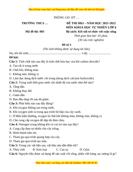 MÔN KHOA HỌC TỰ NHIÊN LỚP 6 Mã đề thi: 003