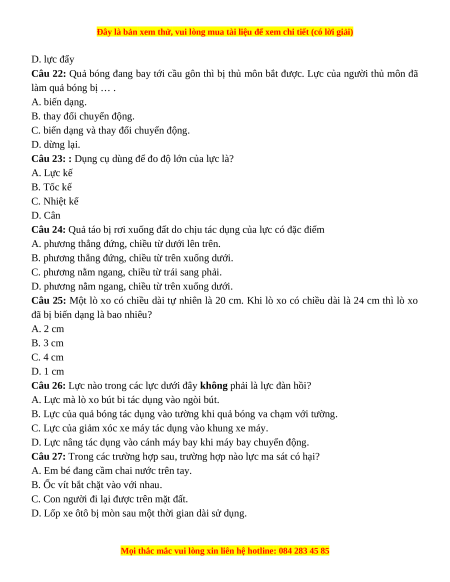 Câu 26: Lực nào trong các lực dưới đây không phải là lực đàn hồi?