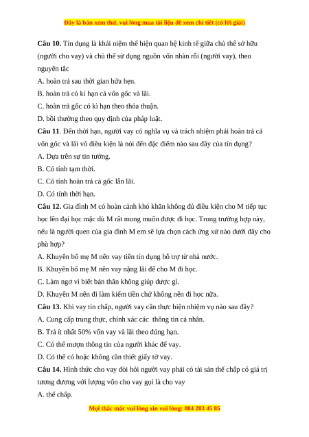 Câu 14. Hình thức cho vay đòi hỏi người vay phải có tài sản thế chấp có giá trị