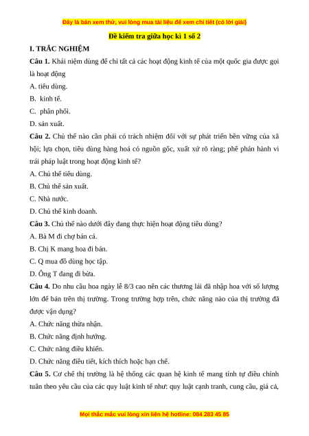 Câu 1. Khái niệm dùng để chỉ tất cả các hoạt động kinh tế của một quốc gia được gọi là hoạt động A. tiêu dùng. B. kinh tế. C. phân phối. D. sản xuất.