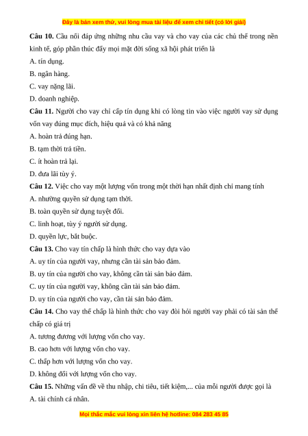 Câu 12. Việc cho vay một lượng vốn trong một thời hạn nhất định chỉ mang tính