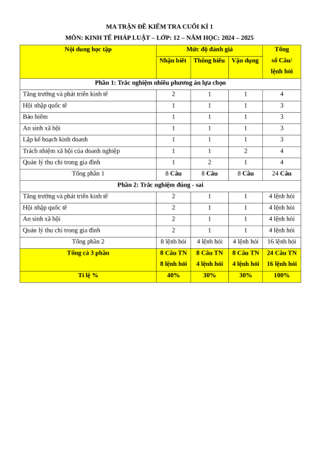 MÔN: KINH TẾ PHÁP LUẬT – LỚP: 12 – NĂM HỌC: 2024 – 2025 Nội dung học tập Mức độ đánh giá Tổng Nhận biết