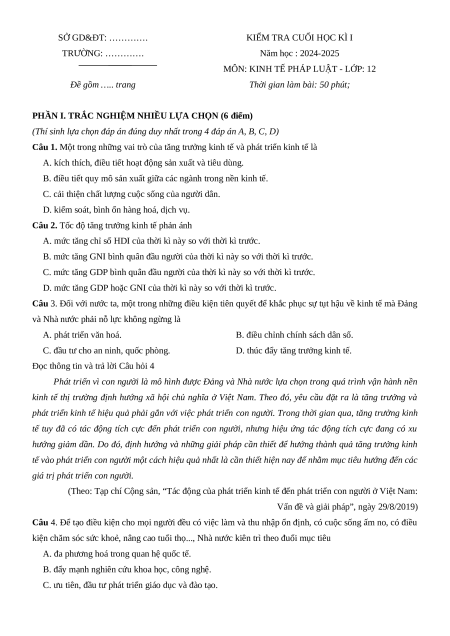 MÔN: KINH TẾ PHÁP LUẬT - LỚP: 12 Đề gồm ….. trang
