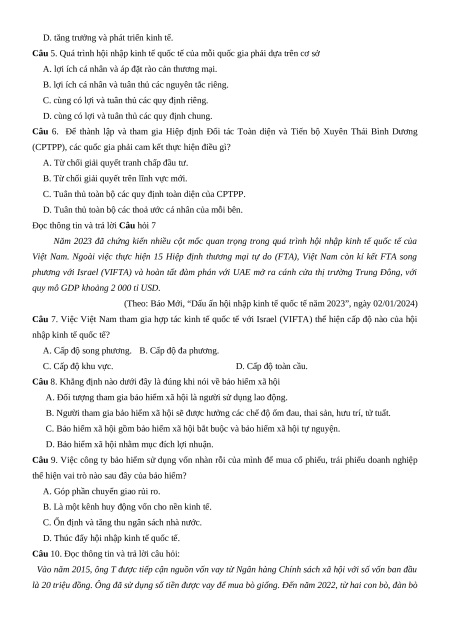Câu 7. Việc Việt Nam tham gia hợp tác kinh tế quốc tế với Israel (VIFTA) thể hiện cấp độ nào của hội nhập kinh tế quốc tế?