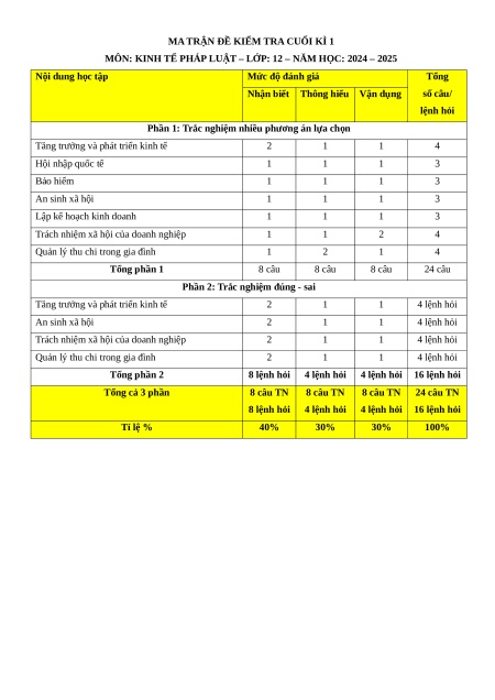 MÔN: KINH TẾ PHÁP LUẬT – LỚP: 12 – NĂM HỌC: 2024 – 2025 Nội dung học tập Mức độ đánh giá Tổng Nhận biết