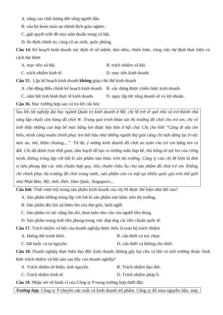 Câu 14. Kế hoạch kinh doanh xác định rõ sứ mệnh, tầm nhìn, chiến lược, công việc dự định thực hiện và cách đạt được A. mục tiêu xã hội. B. trách nhiệm xã hội. C. trách nhiệm kinh tế. D. mục tiêu kinh doanh.