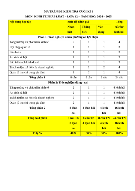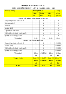 MÔN: KINH TẾ PHÁP LUẬT – LỚP: 12 – NĂM HỌC: 2024 – 2025 Nội dung học tập Mức độ đánh giá Tổng Nhận Thông Vận số câu/ biết hiểu dụng lệnh hỏi