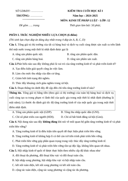 MÔN: KINH TẾ PHÁP LUẬT - LỚP: 12 Đề gồm ….. trang