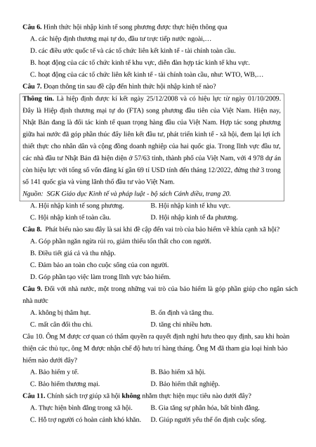 Câu 5. Hội nhập kinh tế quốc tế được thực hiện theo nhiều cấp độ khác nhau như