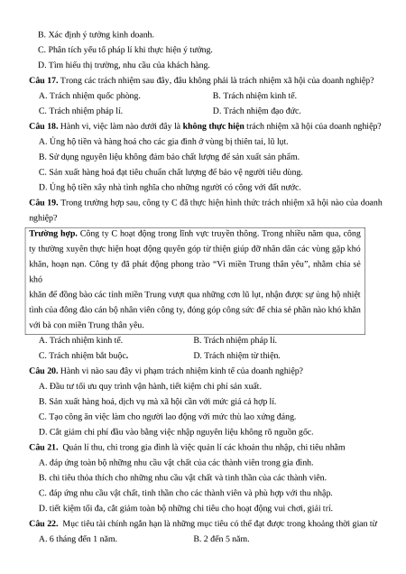 Câu 14. Đâu không phải là tiêu chí đánh giá mục tiêu kinh doanh? A. Tính khả thi. B. Tính сụ thể. C. Tính rõ ràng. D. Tính nhất quán.