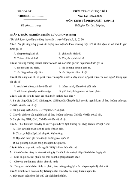 MÔN: KINH TẾ PHÁP LUẬT - LỚP: 12 Đề gồm ….. trang
