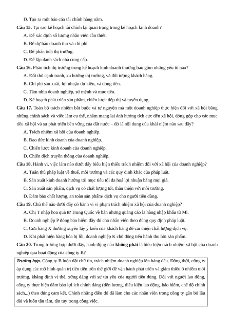 Câu 20. Trong trường hợp dưới đây, hành động nào không phải là biểu hiện trách nhiệm xã hội của doanh