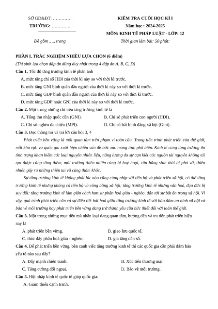 MÔN: KINH TẾ PHÁP LUẬT - LỚP: 12 Đề gồm ….. trang