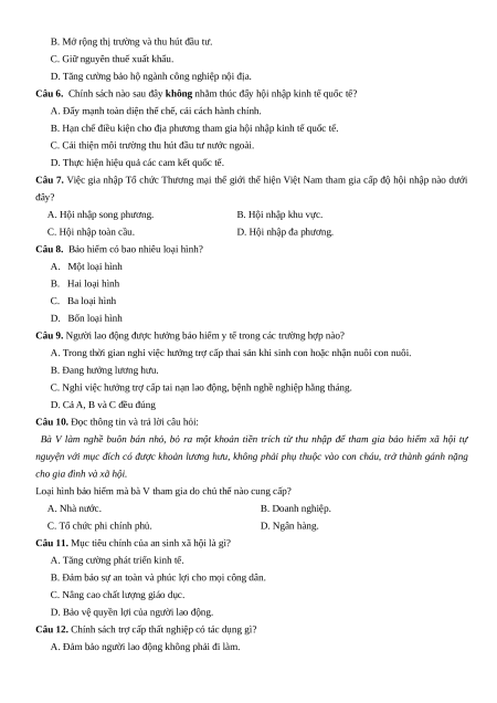 Câu 7. Việc gia nhập Tổ chức Thương mại thế giới thể hiện Việt Nam tham gia cấp độ hội nhập nào dưới đây? A. Hội nhập song phương. B. Hội nhập khu vực. C. Hội nhập toàn cầu. D. Hội nhập đa phương.