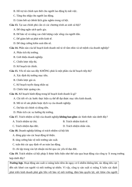 Câu 17. Trách nhiệm xã hội của doanh nghiệp không bao gồm các hình thức nào dưới đây? A. Trách nhiệm tự chủ. B. Trách nhiệm kinh tế.