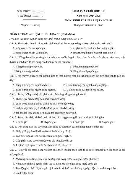 MÔN: KINH TẾ PHÁP LUẬT - LỚP: 12 Đề gồm ….. trang