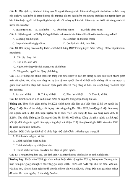 Câu 8. Một dịch vụ tài chính thông qua đó người tham gia bảo hiểm sẽ đóng phí bảo hiểm cho bên cung